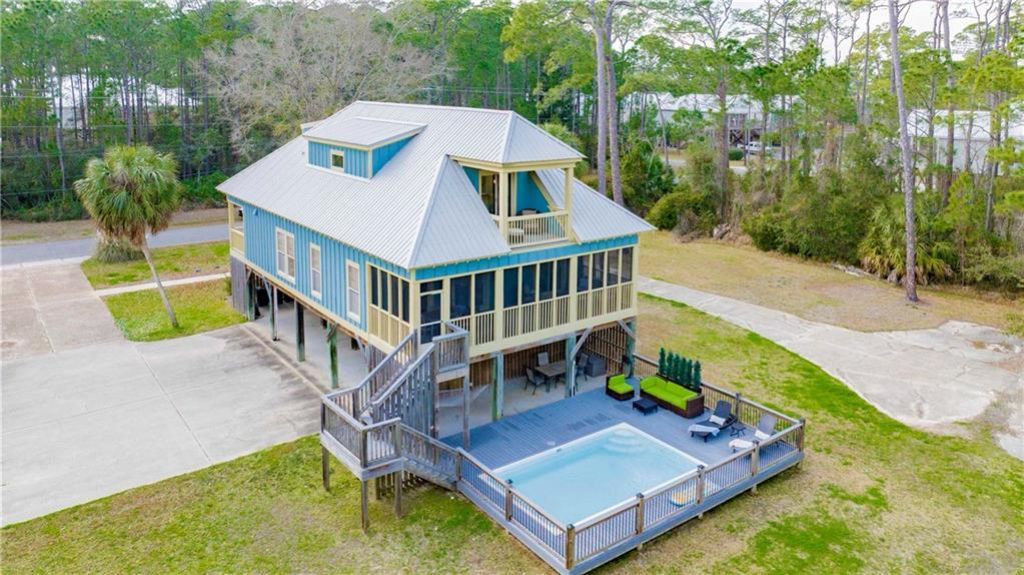 Welcome to 166 Orleans Drive, a truly special piece of Dauphin Island history. This beautiful home includes THREE separate lots (Lots 5, 6 & 7), and is the original Savage property--one of the earliest families to reside on Dauphin Island. Custom designed for the builder's family, this one-owner home reflects quality craftsmanship, intentional design, and thoughtful details throughout. Designed for modern coastal living, this 4-bedroom, 3-bathroom two-story home offers approx. 2,350 sqft. of living space plus an impressive 672 sqft. of porches to soak in the breeze and enjoy peaceful views of Salt Creek. The spacious layout offers room to gather or to retreat, while expansive screened, shuttered, and open porches create the perfect setting for morning coffee, sunset conversations, and watching the coastal wildlife that makes Dauphin Island special. Inside you will find a gourmet kitchen, built in shelves (stairwell), an open concept living/dining area, lots of natural light, and detailed/elevated features including custom closets by Inspired Closets Mobile. Step outside to your private backyard oasis featuring an in-ground saltwater heated POOL, allowing for extended seasonal enjoyment. The surrounding Trex decking provides durability and low-maintenance living, perfect for entertaining or relaxing after a beach day. The home also includes a built-in elevator shaft, offering future flexibility for multi-generational use. Whether you're searching for a primary residence or a rental investment, this property delivers both lifestyle and income potential, supported by a strong rental history. This legacy property combines history, location, quality construction, and versatility-all in one beloved setting--Dauphin Island. You'll love being close to DI Mardi Gras parade route, bike and walking trails, the playground and basketball courts, and 1/2 mile to the multiple beaches with a front row view of Salt Creek. Don't miss this unique and special property! Buyer to verify Bu